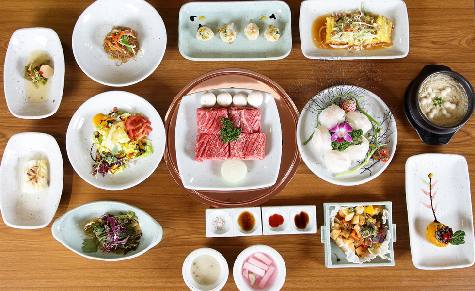 계절죽/활어 회/계절 샐러드/탕평채/궁중 잡채/ 해물냉채/꽃게 양념무침/ 계절 김치/ 장아찌/ 상추 / 고기야채/ 영양부추 / 코다리 찹쌀 양념구이/ 보리새우 두부강정/소고기와 낙지볶음